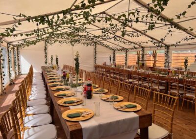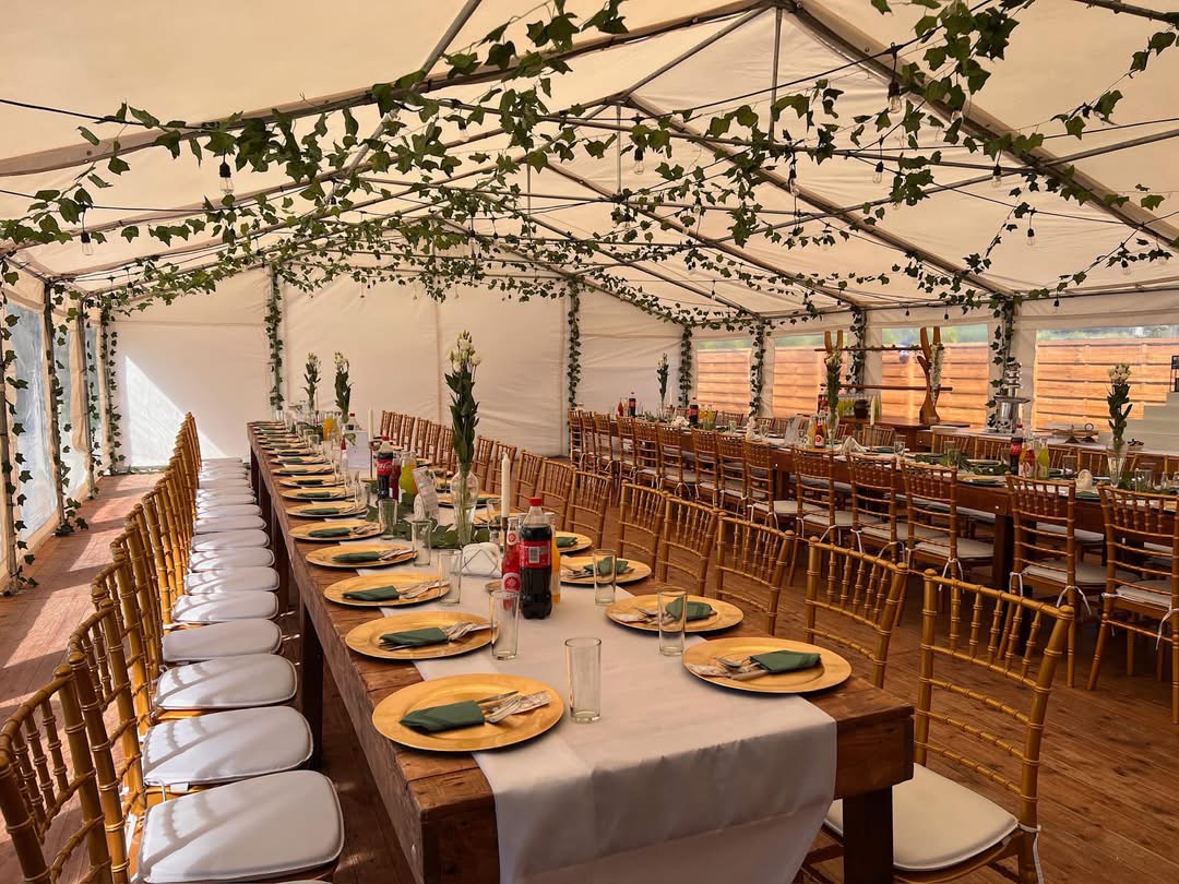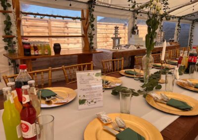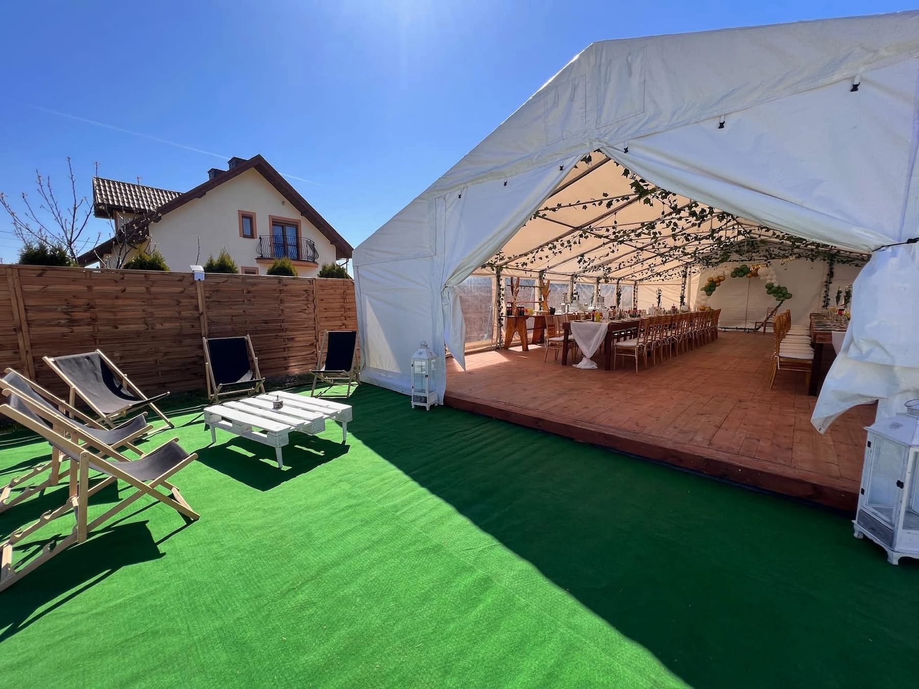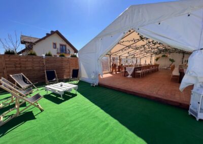 Zdjęcia przedstawiają teren działania i realne realizacje, które wykonaliśmy dla naszych klientów. Dbamy o każdy szczegół – od stabilnej konstrukcji namiotów, przez estetyczne ustawienie stołów, aż po odpowiednie dopasowanie dodatków. Wszystkie elementy wyposażenia są zadbane, czyste i gotowe do użycia, aby każda impreza była wyjątkowa.
